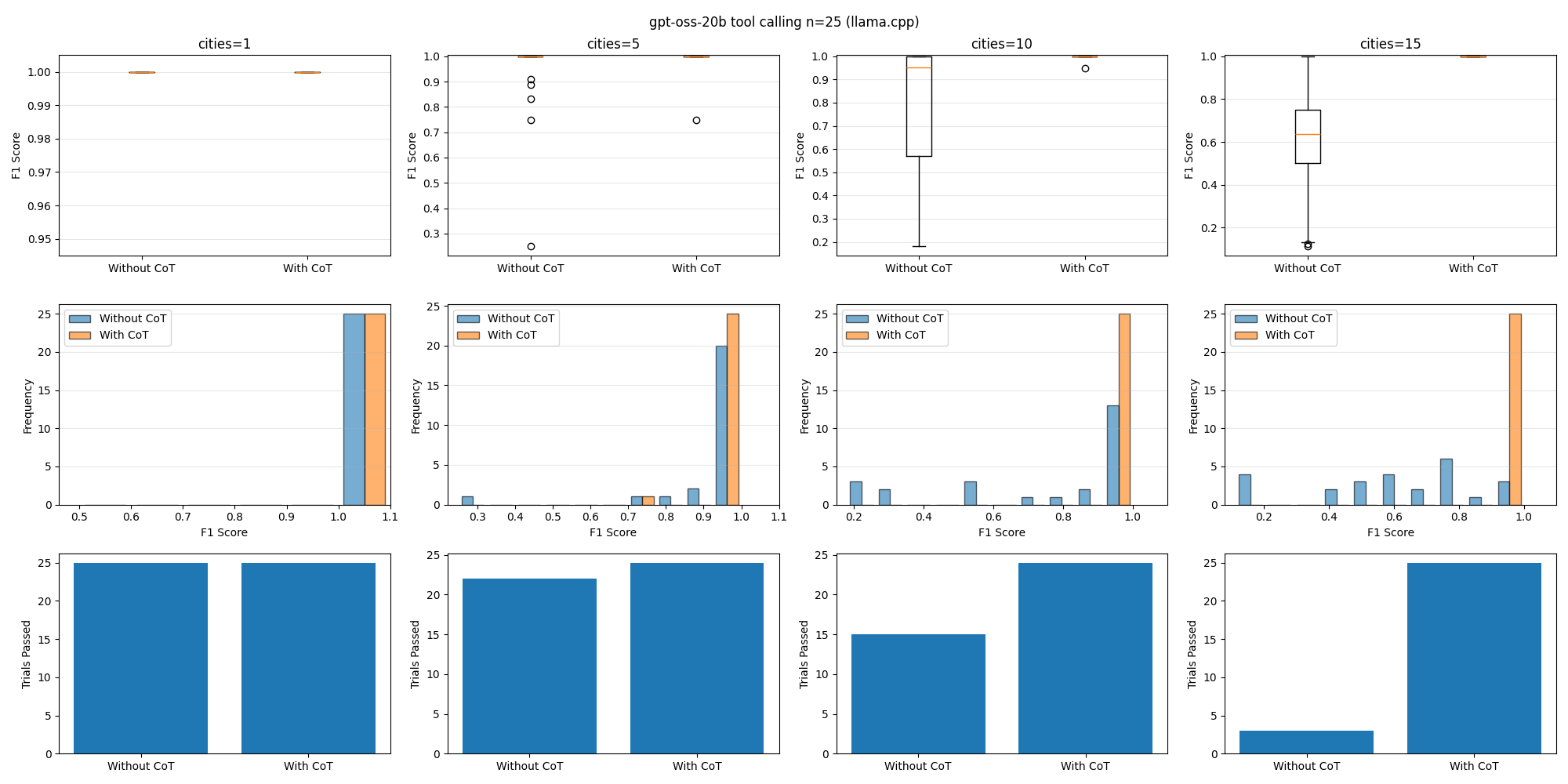 Here are the results with llama.cpp and gpt-oss-20b. The F1 score is a function of precision and recall. A score of 1.0 means perfect precision/recall. In other words, it performed all necessary tool calls with no failed or redundant calls. The bottom bar charts show the number of trials that successfully completed the task. If there is a better metric to use, I am happy to add that in as well, but I think this does a good job of illustrating the problem.